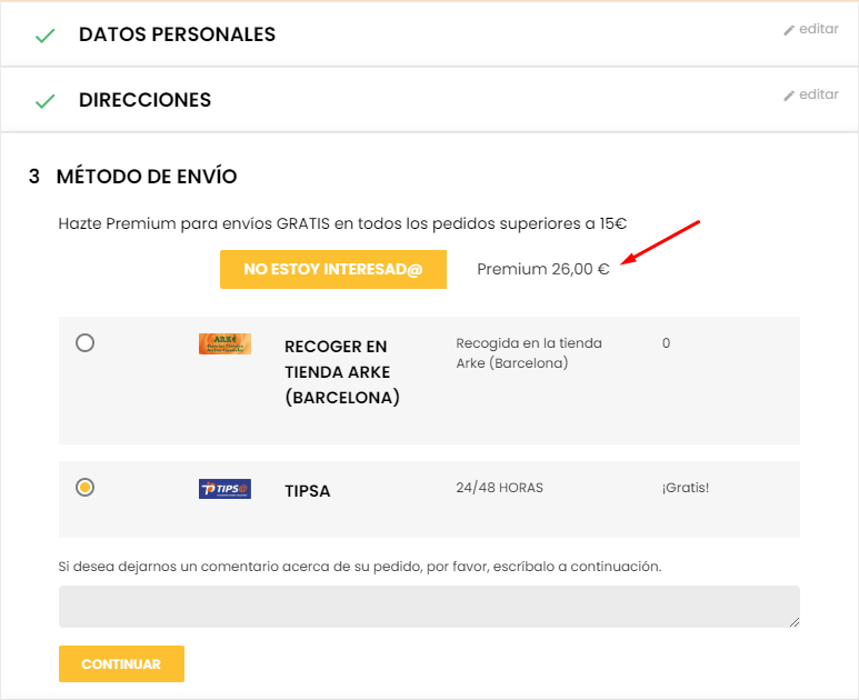 Cuando vayas a finalizar la compra, en el método de envío aparecerá la opción para unirse premium,deberás hacer click en premium y desde ese mismo pedido, dispondrás de envíos gratis durante 1 año en pedidos superiores a 15€.